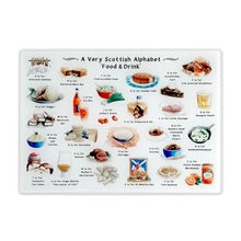 A Very Scottish Alphabet 'Food & Drink' Glass Cutting Board